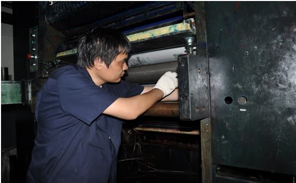 生產(chǎn)壓力越大,員工們的工作熱情卻越來越高漲。7月4日,設備科接書刊分公司緊急通知,主力設備高斯八色輪轉(zhuǎn)膠印機4550由于八開折頁滾筒夾板軸斷裂停機,科室迅速組織搶修隊伍進入現(xiàn)場,冒著高溫開始了極其復雜的維修工作。