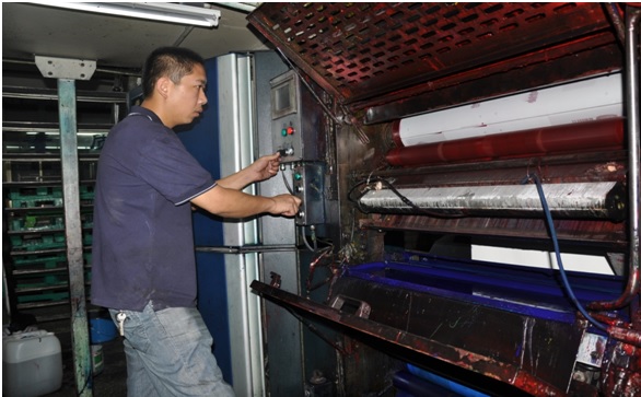 從6月初開始,天聞印務的生產(chǎn)車間,幾乎成了公司干部員工的臨時“食堂”。龔衛(wèi)東解釋說,按照公司現(xiàn)有的生產(chǎn)能力,要完成今年的秋課任務,所有設備必須滿負荷運轉(zhuǎn),這就對設備管理人員提出了“人不離崗”的要求。“所以,每到用餐時間,食堂的工作人員就推著飯菜走進車間,大家穿著早已汗?jié)竦墓ぷ鞣?,拿著自帶飯盒,在工作現(xiàn)場用餐。”