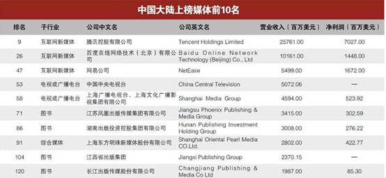 贏利能力最強(qiáng)的媒體公司是谷歌,利潤(rùn)達(dá)194.78億美元;臉書(shū)(Facebook)利潤(rùn)102.17億美元,排名第二;迪斯尼公司利潤(rùn)為93.66億美元,排名第三。利潤(rùn)前十強(qiáng)的媒體公司中,9家來(lái)自美國(guó),另外一家是來(lái)自中國(guó)大陸的騰訊。