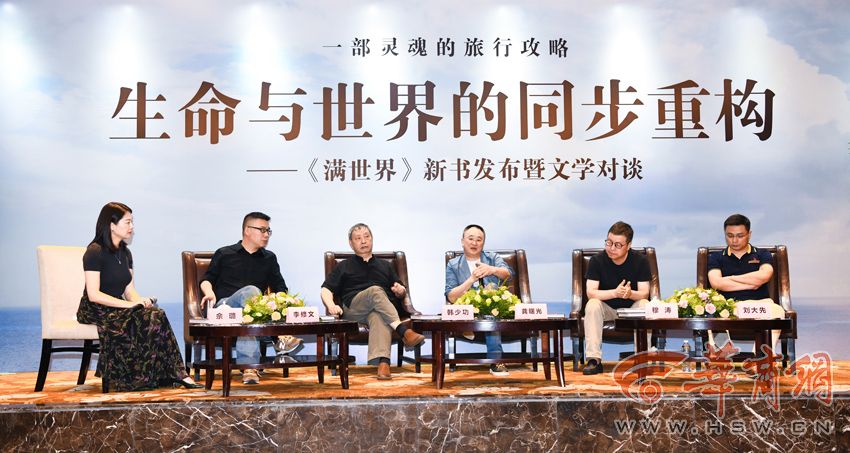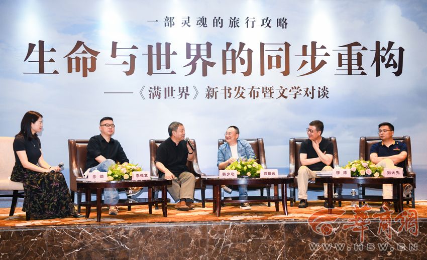 新書發(fā)布會現(xiàn)場,著名文學(xué)家韓少功,著名作家、編劇、影視監(jiān)制李修文,中國社科院研究員、《民族文學(xué)研究》雜志副主編劉大先,《美文》雜志常務(wù)副主編、陜西省文藝評論家協(xié)會副主席穆濤和《滿世界》作者龔曙光,與來自全國各地媒體記者和讀者一起,展開了一場帶著靈魂旅行的討論。