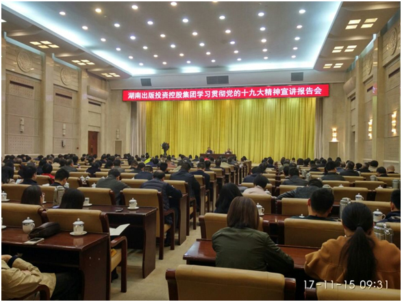 11月15日上午,湖南出版投資控股集團學(xué)習(xí)貫徹黨的十九大精神宣講報告會在九所賓館會議中心舉行。黨的十九大代表、湖南新聞出版廣電局黨組書記朱建綱應(yīng)邀作輔導(dǎo)報告,集團黨委書記、董事長,中南傳媒董事長龔曙光主持會議。集團黨委領(lǐng)導(dǎo)、中南傳媒高管、子分公司全體集團管理干部、控股集團和中南傳媒總部員工共300余人參加會議。